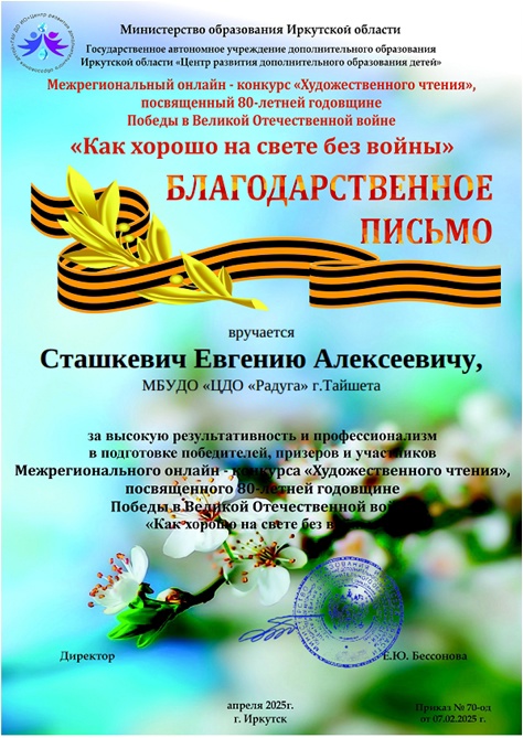 Это достижение стало возможным благодаря не только таланту и усердной работе самой Яны, но и высокому профессионализму ее наставника — Сташкевича Евгения Алексеевича. Как педагог дополнительного образования, он проявил невероятную преданность делу, помогая своей ученице подготовиться к конкурсу. Его опыт и знания сыграли ключевую роль в формировании артистических навыков Яны, что в итоге отразилось на ее успешном выступлении.