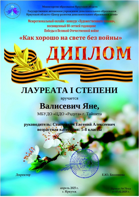 В мире искусства и творчества важным событием стало участие обучающейся шоу-театра "Успех" Валисевич Яны в Межрегиональном онлайн-конкурсе "Художественного чтения", посвященном 80-летней годовщине Победы в Великой Отечественной войне. Конкурс, который носит название "Как хорошо на свете без войны", собрал множество талантливых участников со всей Иркутской области, но Яна смогла выделиться среди них и завоевать заслуженное звание лауреата 1 степени в возрастной категории 5-8 классов.
