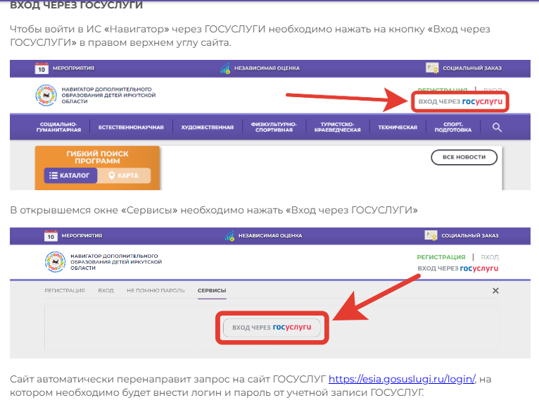 Чтобы войти в ИС «Навигатор» через ГОСУСЛУГИ необходимо нажать на кнопку «Вход через ГОСУСЛУГИ» в правом верхнем углу сайта.