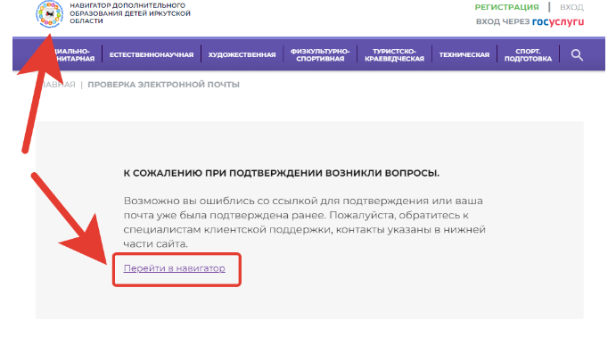 Если по ссылке пройти еще раз, сайт сообщит, что «К сожалению при подтверждении возникли вопросы». В этом нет ничего страшного, просто перейдите на главную страницу сайта, нажав либо на значок сайта вверху слева, либо нажмите на ссылку «Перейти в Навигатор» внизу сообщения.