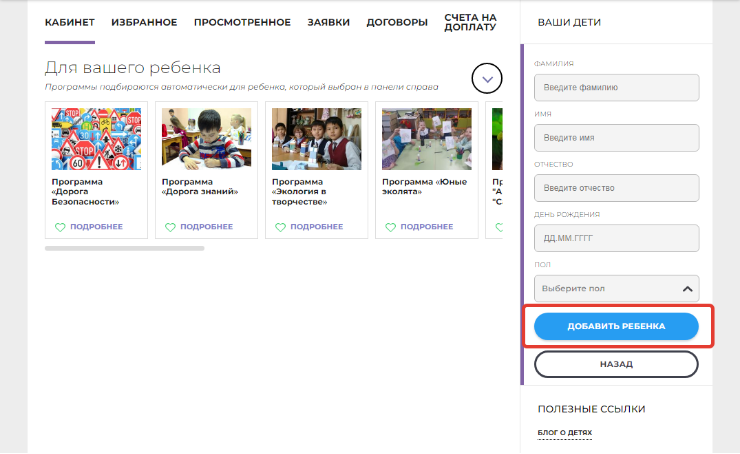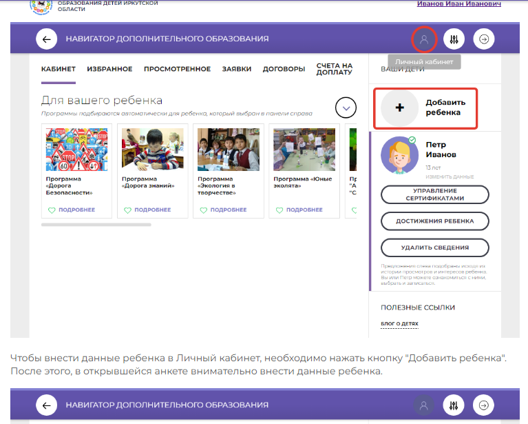 В Личном кабинете ИС «Навигатор» родителю (законному представителю), после регистрации и подтверждения электронной почты, предоставляется доступ к добавлению данных детей в разделе «Ваши дети».