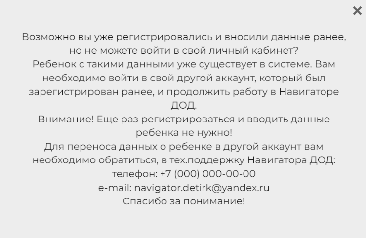 Если при внесении данных ребенка вам показывается сообщение «Возможно вы уже регистрировались и вносили данные ранее?» это означает, что данные ребенка уже есть в системе. Не нужно изменять фамилию, имя, отчество или дату рождения ребенка, чтобы «хоть как-то» внести данные.