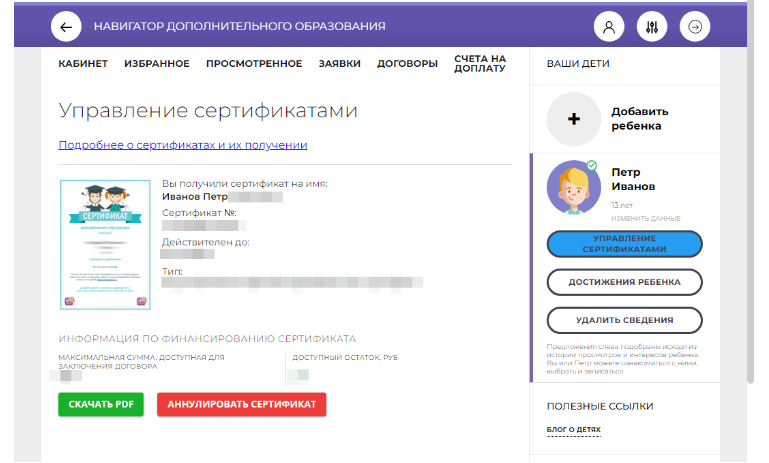 После того, как данные ребенка будут подтверждены в любом учреждении, программы которого размещены на ИС «Навигатор» https://р38.навигатор.дети, можно зайти в раздел «Управление сертификатами» и ознакомиться с информацией о сертификате ребенка.