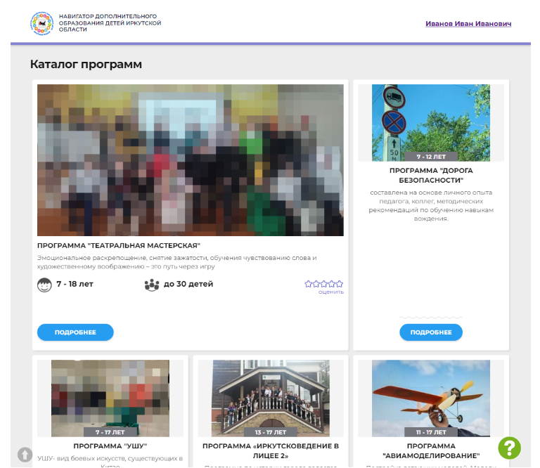 На главной странице ИС «Навигатор» https://р38.навигатор.дети родители (законные представители) получают доступ к каталогу программ, на которые ведется запись. Чтобы открыть карточку интересующей программы, необходимо нажать кнопку «Подробнее».