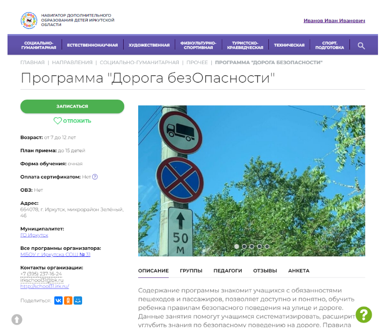 В карточке программы представлена подробная информация о детском объединении: описание процесса обучения, компетенции, которыми овладеет ребенок, цели и задачи обучения, ожидаемые результаты, расписание, контактные данные организатора, адрес проведения занятий. Здесь же прописываются особые условия при приеме детей, если они есть, например, наличие заключения врача.
