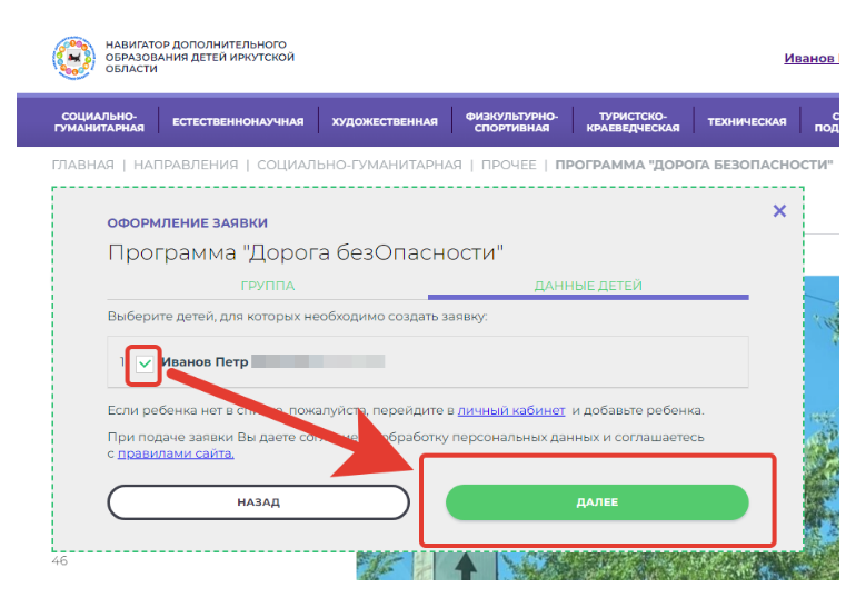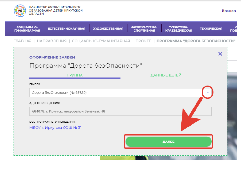 В открывшемся окне необходимо выбрать группу из предложенных и нажать «Далее». В следующем окне необходимо выбрать ребенка, поставив галочку перед данными ребенка. Нажимаем «Далее». ЗАЯВКА ОТПРАВЛЕНА.