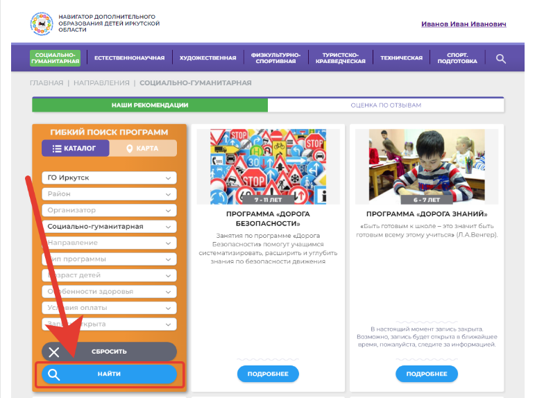 Для записи ребенка на программу удобно использовать форму гибкого поиска программ. Можно задать один или несколько параметров и нажать кнопку «Найти».