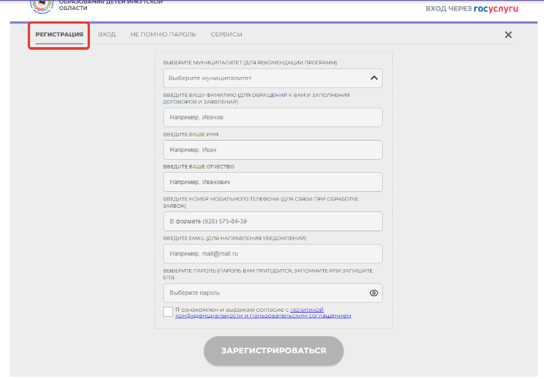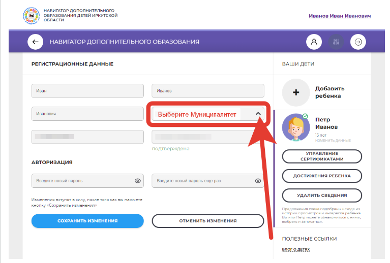 При успешной авторизации откроется Личный кабинет родителя (законного представителя). Пожалуйста, в «Регистрационных данных» внесите информацию о Муниципалитете, в котором вы проживаете (ГО - город, МР - район. Например, ГО Иркутск - город Иркутск, а МР Иркутский - Иркутский район).