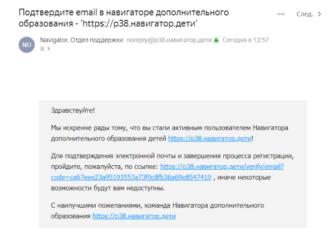 После заполнения регистрационной формы и нажатия кнопки «Зарегистрироваться» на указанный адрес электронной почты будет направлено системное сообщение от отдела поддержки ИС «Навигатор» для подтверждения электронного адреса. Необходимо пройти по ссылке, указанной в письме, для получения полных прав для работы с системой. По ссылке необходимо пройти один раз.